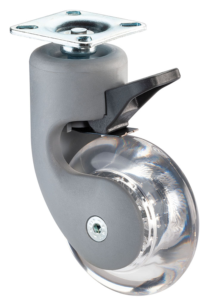 Designové kolečko v plastové vidlici s tvrdým transparentním kolem s brzdou