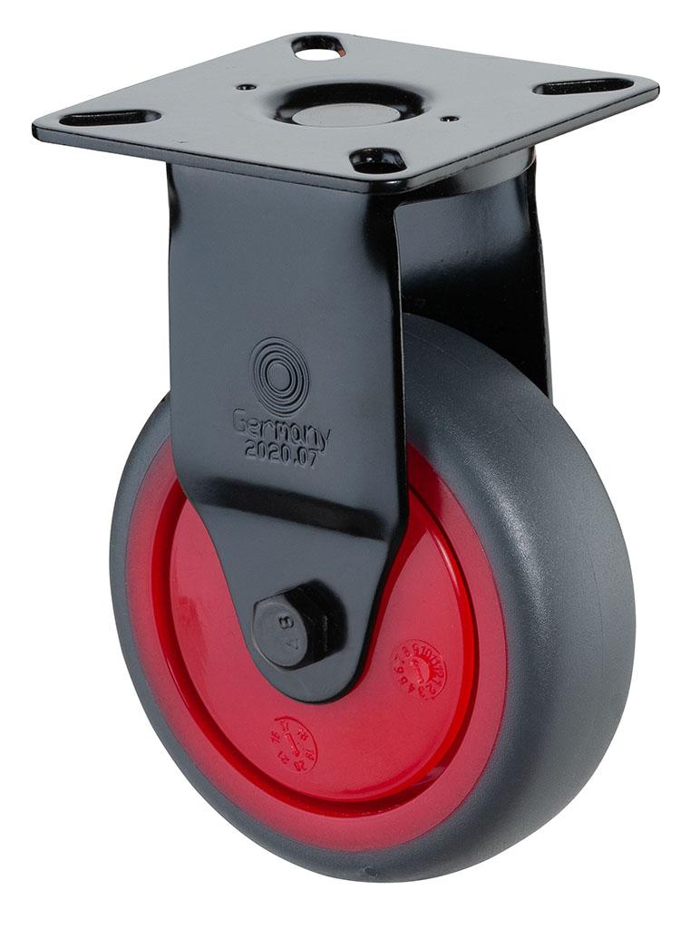 Přístrojové kolečko s šedým pryžovým nešpinícím běhounem v pevné vidlici s uchycením na plotnu na čtyři šrouby