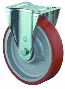 vidlice: ocelový pozinkovaný plech s dvojitým kuličkovým věncem, kolo: litinové s polyuretanovým běhounem Shore A 92 na kuličkovém ložisku