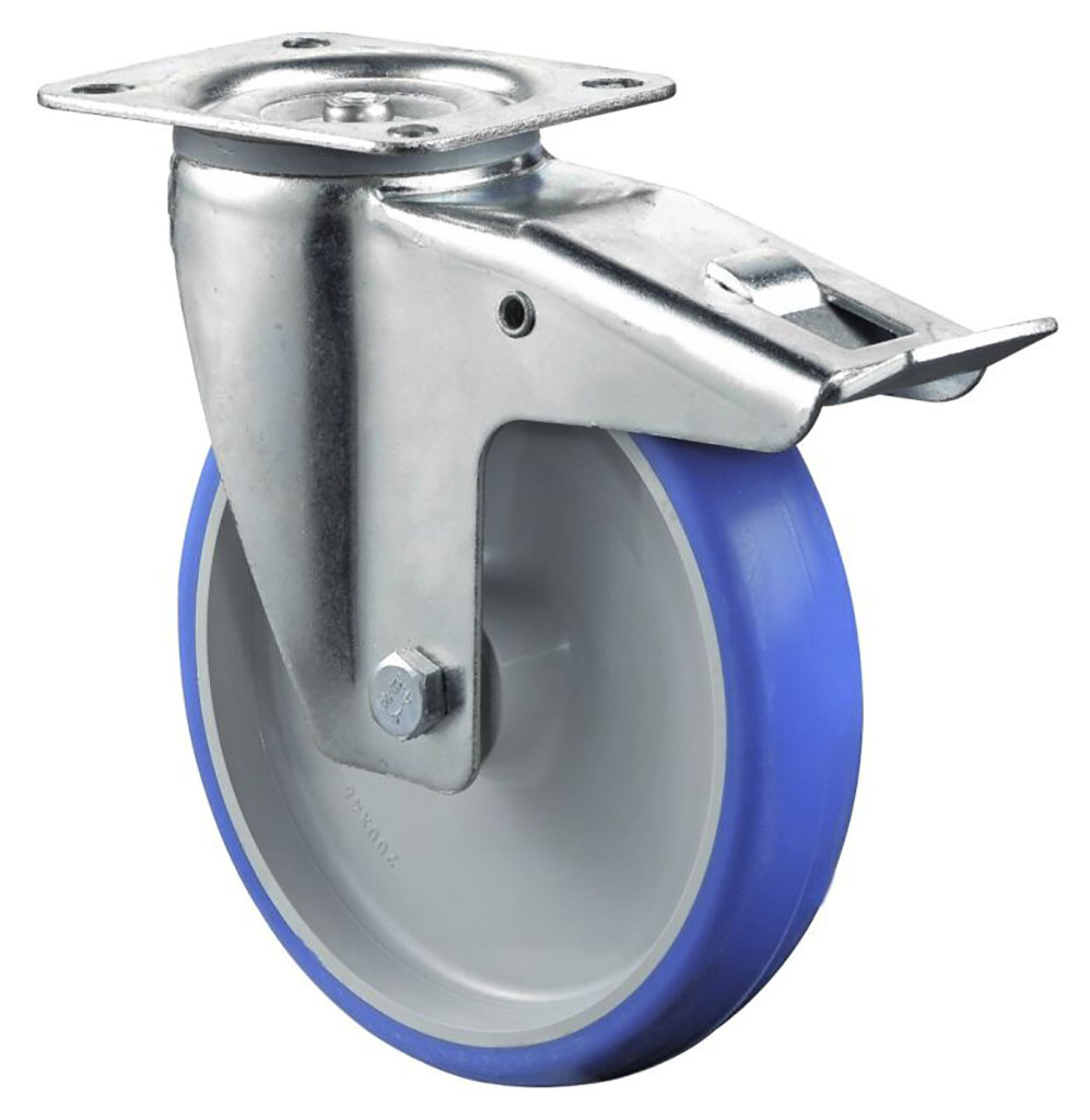 vidlice: ocelový pozinkovaný plech s dvojitým kuličkovým věncem, kolo: bílý polyamid s modrým polyuretanovým běhounem Shore A 85 na jehlovém ložisku