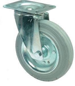 vidlice: ocelový pozinkovaný plech s dvojitým kuličkovým věncem, kolo: plechové s šedou nešpinící gumou na jehlovém ložisku