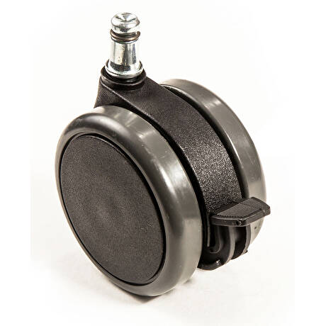 Dvojité plastové kolečko s běhounem z šedé nešpinící pryže a s brzdou pro kancelářskou židli s uchycením na čep