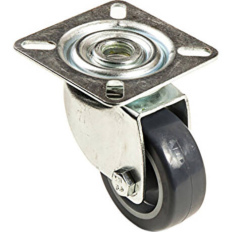 Plastové nábytkové kolečko s šedým polyuretanovým nešpinícím běhounem v otočné vidlici s uchycením na plotnu na čtyři šrouby