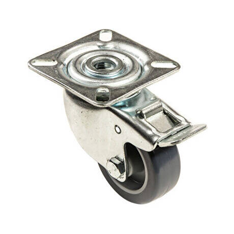 Plastové nábytkové kolečko s šedým polyuretanovým nešpinícím běhounem v otočné vidlici s brzdou s uchycením na plotnu na čtyři šrouby