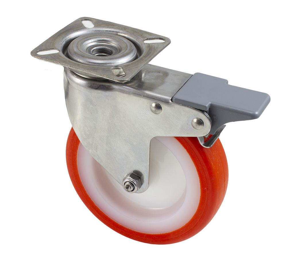 Plastové kolečko s oranžovým polyuretanovým nešpinícím běhounem v otočné nerezové vidlici s uchycením na čtyři šrouby