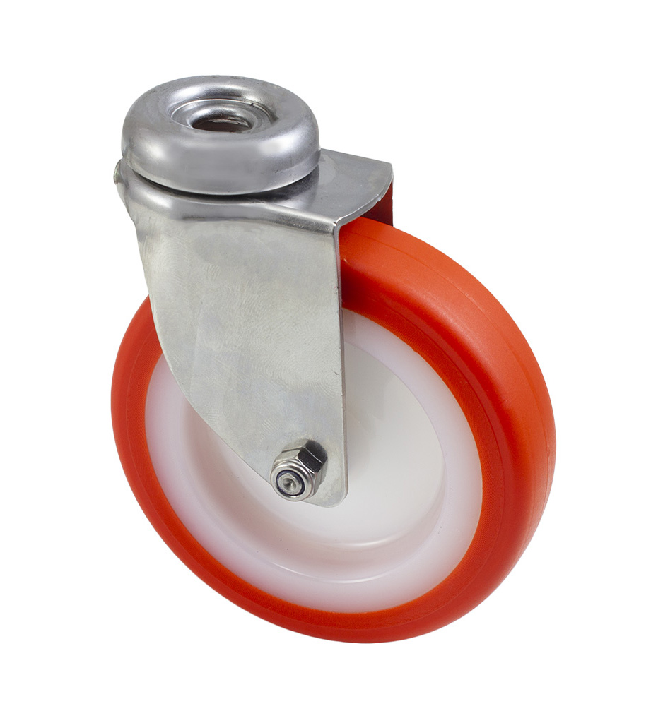 Plastové kolečko s oranžovým polyuretanovým nešpinícím běhounem v otočné nerezové vidlici s uchycením na jeden šroub