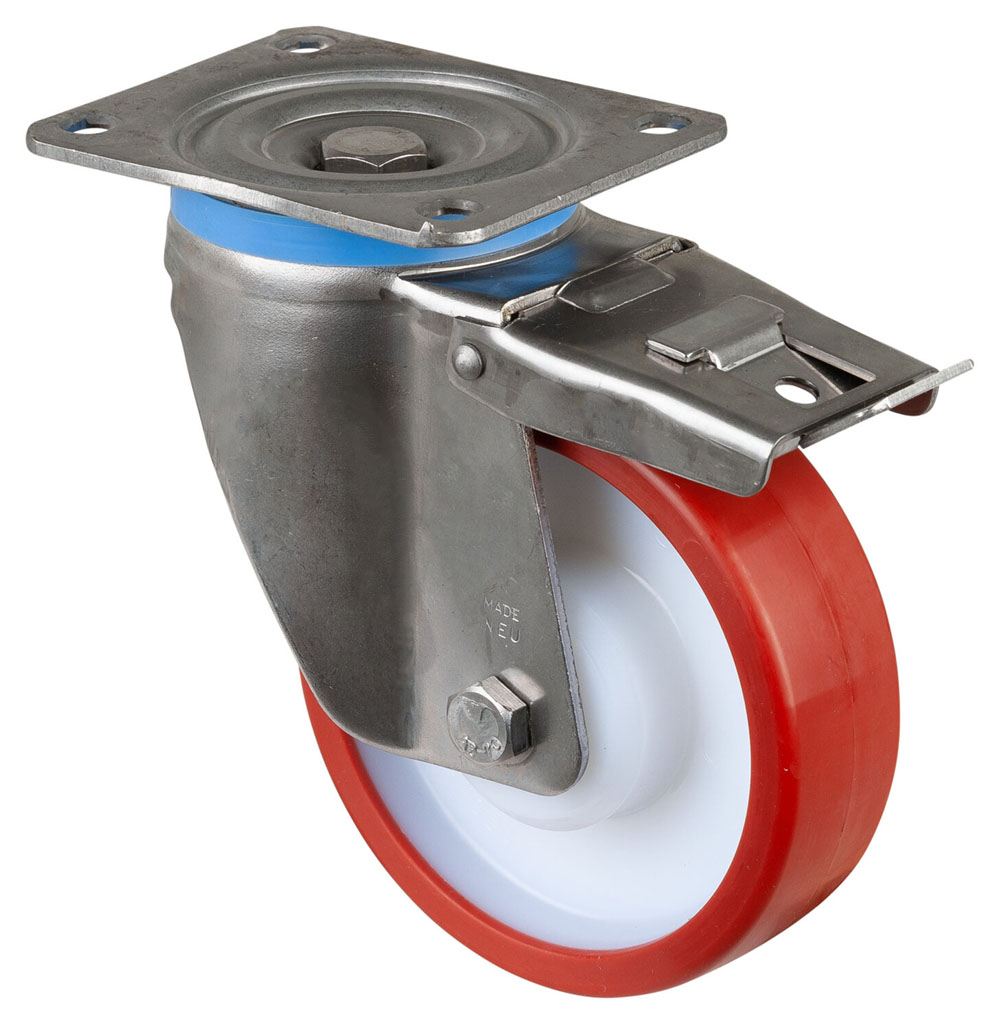 Transportní kolo s polyuretanovým běhounem v otočné nerezové vidlici s brzdou s uchycením na čtyři šrouby