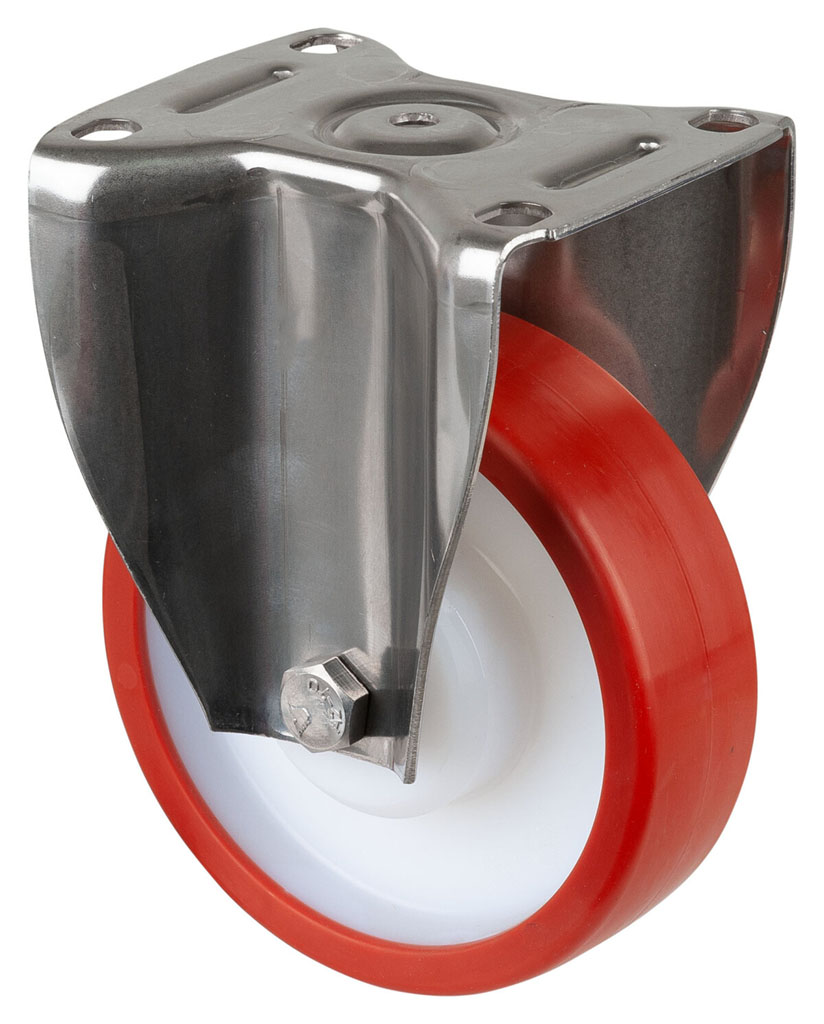 Transportní kolo s polyuretanovým běhounem v pevné nerezové vidlici s uchycením na čtyři šrouby