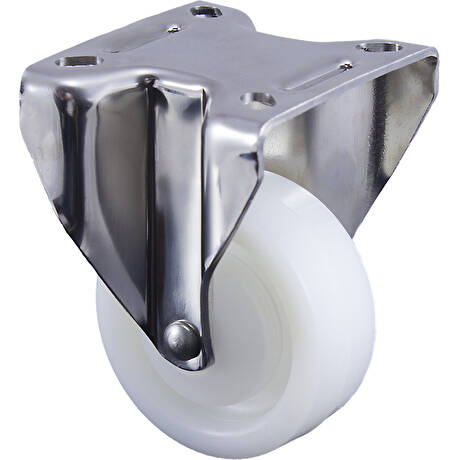 Polyamidové kolečko v pevné nerezové vidlici s uchycením na plotnu na čtyři šrouby