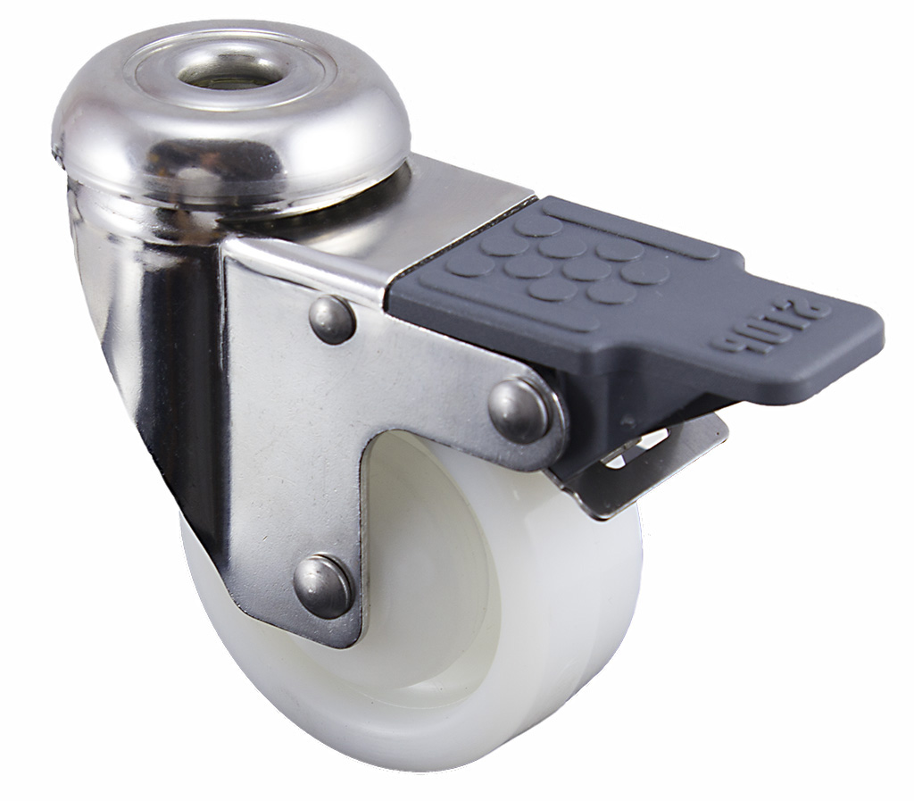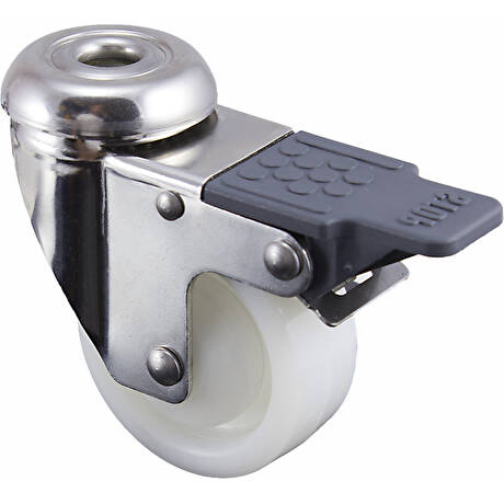 Polyamidové kolečko v otočné nerezové vidlici s brzdou s uchycením na jeden šroub