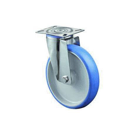 vidlice: nerezový plech s dvojitým kuličkovým věncem, kolo: bílý polyamid s modrým polyuretanovým běhounem Shore A 85 na kluzném ložisku