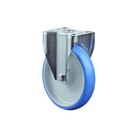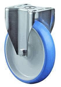 vidlice: nerezový plech s dvojitým kuličkovým věncem, kolo: bílý polyamid s modrým polyuretanovým běhounem Shore A 85 na kluzném ložisku