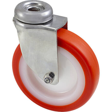 Plastové kolečko s oranžovým polyuretanovým nešpinícím běhounem v otočné nerezové vidlici s uchycením na jeden šroub
