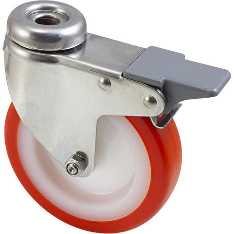 Plastové kolečko s oranžovým polyuretanovým nešpinícím běhounem v otočné nerezové vidlici s brzdou s uchycením na jeden šroub