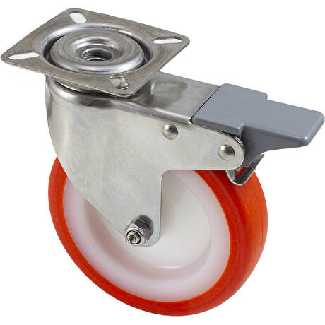Plastové kolečko s oranžovým polyuretanovým nešpinícím běhounem v otočné nerezové vidlici s brzdou s uchycením na čtyři šrouby