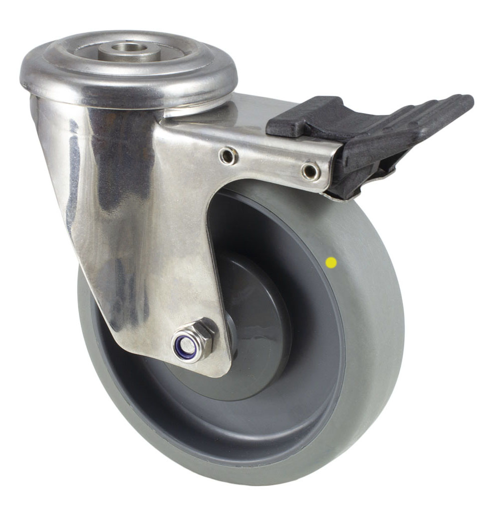 Transportní antistatické kolo s pryžovým běhounem v otočné nerezové vidlici s brzdou s uchycením na jeden šroub