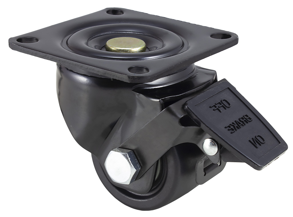 DŮM KOLEČEK » Nízkoprofilové a stavitelné kladky » Nízkoprofilová pojezdová kola série NZB » Otočné provedení + brzda s uchycením na čtyři šrouby - kuličkové ložisko