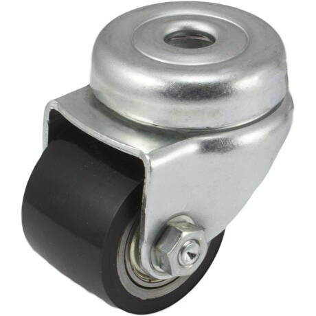Nízkoprofilové kolečko s polyuretanovým běhounem a kuličkovým ložiskem v otočné vidlici s uchycením na jeden šroub
