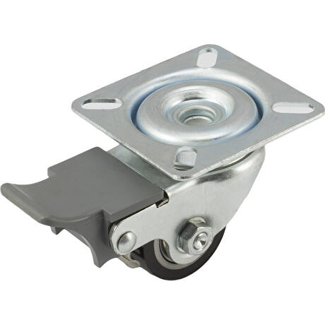 Nízkoprofilové kolečko s polyuretanovým běhounem a kuličkovým ložiskem v otočné vidlici s brzdou s uchycením na čtyři šrouby