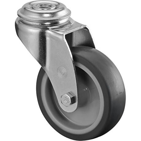 vidlice: ocelový pozinkovaný plech s dvojitým kuličkovým věncem, kolo: plastové s šedou nešpinící gumou na kluzném ložisku