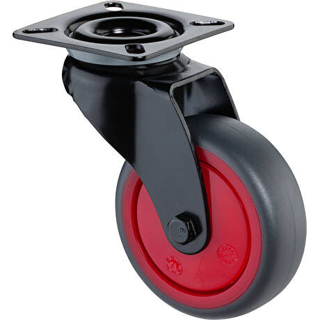 Přístrojové kolečko s šedým pryžovým nešpinícím běhounem v otočné vidlici s uchycením na plotnu na čtyři šrouby