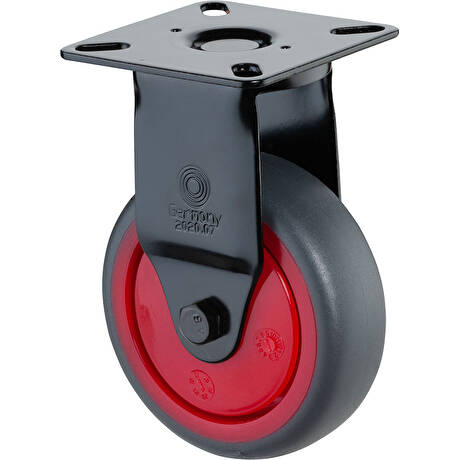 Přístrojové kolečko s šedým pryžovým nešpinícím běhounem v pevné vidlici s uchycením na plotnu na čtyři šrouby