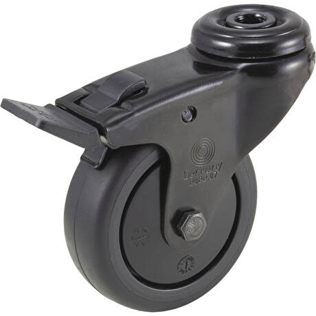 Přístrojové kolečko s černým pryžovým běhounem v otočné vidlici s brzdou s uchycením na jeden šroub