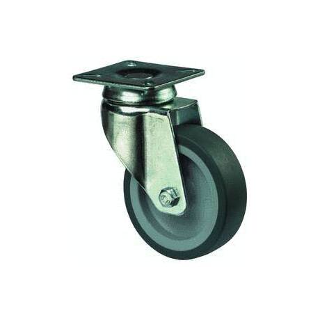 vidlice: ocelový pozinkovaný plech s dvojitým kuličkovým věncem, kolo: plastové s šedou nešpinící gumou na kluzném ložisku