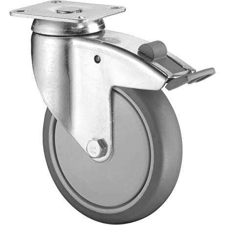 vidlice: ocelový pozinkovaný plech s dvojitým kuličkovým věncem, celokovová brzda, kolo: plastové s šedou nešpinící gumou na kuličkovém ložisku