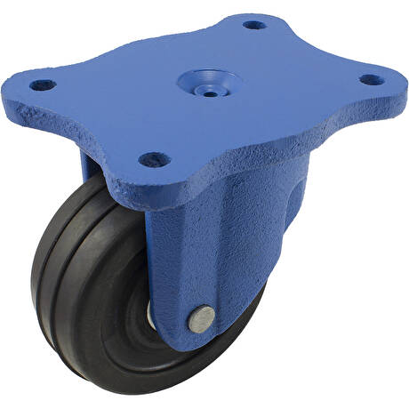 Kolo s černým pryžovým běhounem v otočné litinové vidlici s uchycením na plotnu na čtyři šrouby