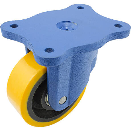 Kolo s polyuretanovým běhounem a litinovým diskem v otočné litinové vidlici s uchycením na plotnu na čtyři šrouby