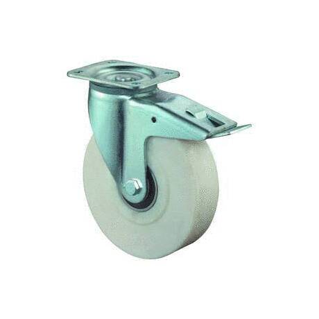 vidlice: ocelový pozinkovaný plech s dvojitým kuličkovým věncem, kolo: litý bílý polyamid na kuličkovém ložisku