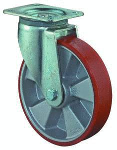 vidlice: ocelový pozinkovaný plech s dvojitým kuličkovým věncem, kolo: hliník s polyuretanovým běhounem Shore A 92 na kuličkovém ložisku