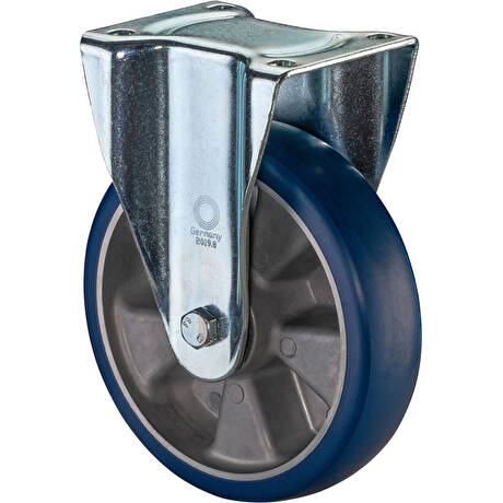 Těžkotonážní kolo série B92 s polyuretanovým běhounem ve vysokozátěžové pevné vidlici s uchycením na plotnu na čtyři šrouby