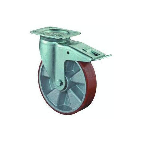 vidlice: ocelový pozinkovaný plech s dvojitým kuličkovým věncem, kolo: hliník s polyuretanovým běhounem Shore A 92 na kuličkovém ložisku