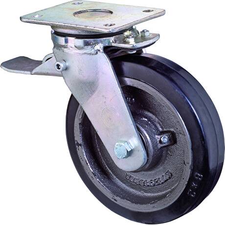Těžkotonážní kolo série B81 s elastickou černou pryží ve vysokozátěžové otočné vidlici s uchycením na plotnu na čtyři šrouby, totální brzda