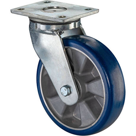 Těžkotonážní kolo série B92 s polyuretanovým běhounem ve vysokozátěžové otočné svařované vidlici s uchycením na plotnu na čtyři šrouby