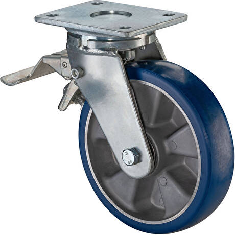 Těžkotonážní kolo série B92 s polyuretanovým běhounem ve vysokozátěžové otočné svařované vidlici s brzdou s uchycením na plotnu na čtyři šrouby