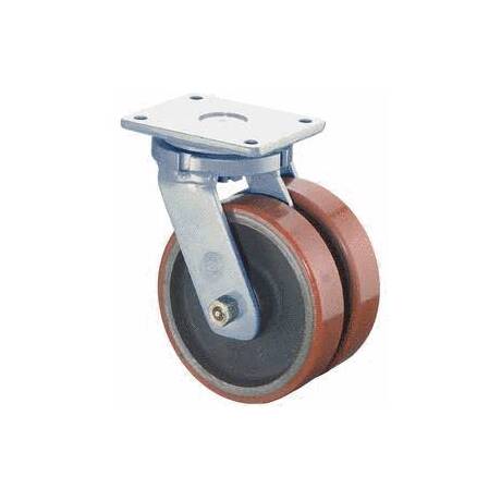 Dvojité zátěžové litinové kolo s polyuretanovým nešpinícím běhounem v masivní svařované vidlici s uchycením na plotnu na čtyři šrouby