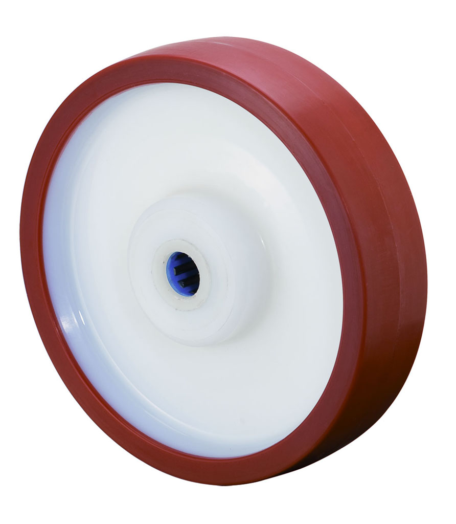 - disk kola - plast, běhoun - červený polyuretan, tvrdost 98 +/- 4 Shore A, odolné vůči teplotám -20 až +70 °C, nerezové jehlové ložisko