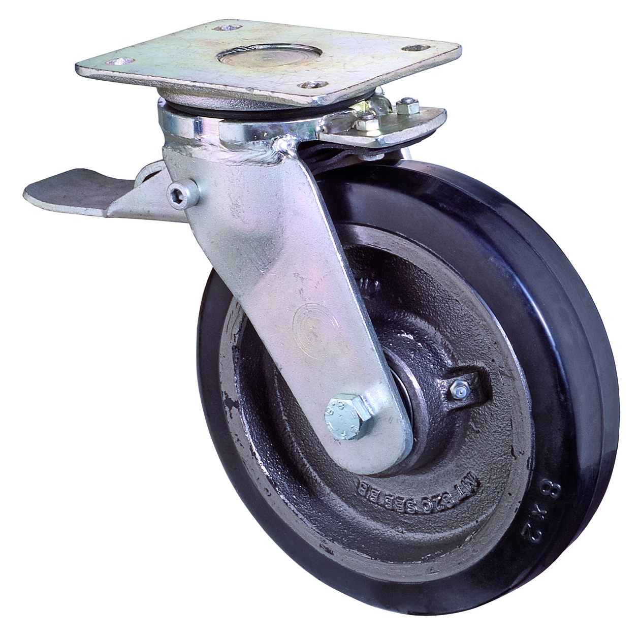 Těžkotonážní kolo série B81 s černou elastickou pryží ve vysokozátěžové otočné vidlici s brzdou s uchycením na plotnu na čtyři šrouby