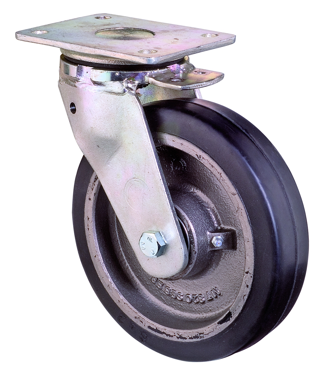 Těžkotonážní kolo série B81 s černou elastickou pryží ve vysokozátěžové otočné vidlici s uchycením na plotnu na čtyři šrouby