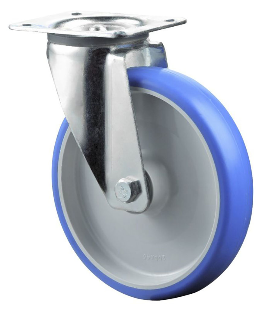- kolo: bílý polyamid s modrým polyuretanovým běhounem Shore A 85 na jehlovém ložisku