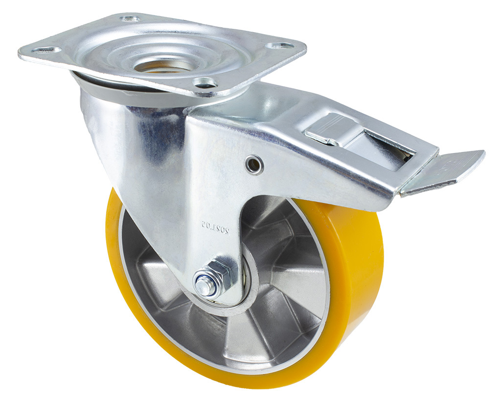 vidlice: ocelový pozinkovaný plech s dvojitým kuličkovým věncem, kolo: hliník s polyuretanovým běhounem Shore A 92 na kuličkovém ložisku