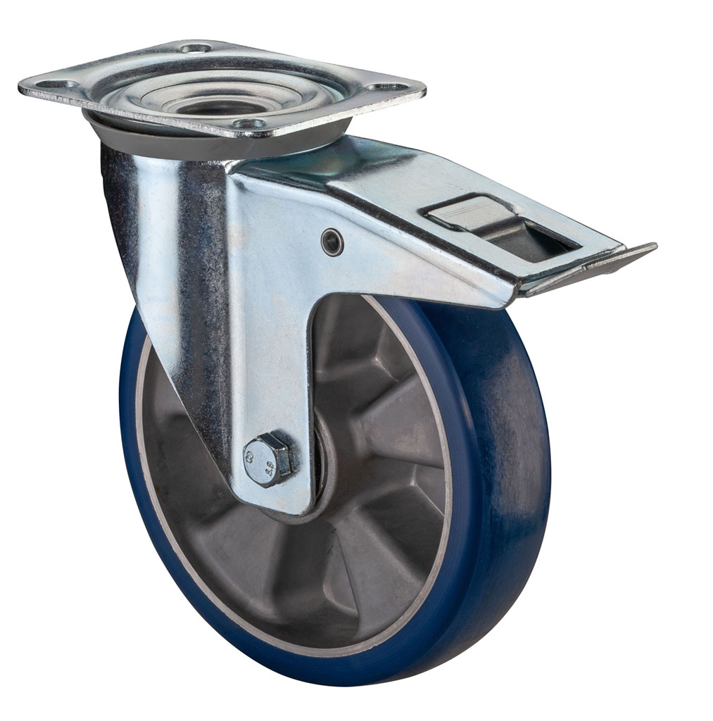 Transportní kolo série B92 s polyuretanovým běhounem v otočné vidlici s brzdou s uchycením na plotnu na čtyři šrouby