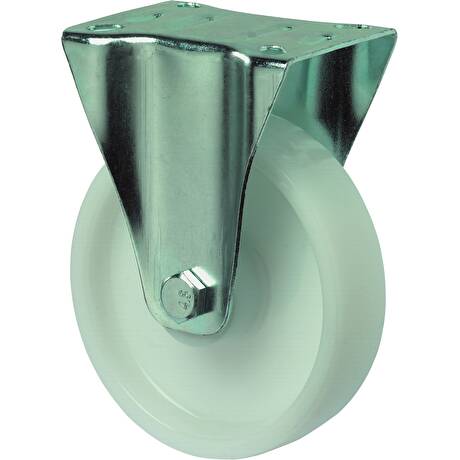 vidlice: ocelový pozinkovaný plech s dvojitým kuličkovým věncem, kolo: bílý polyamid na jehlovém ložisku
