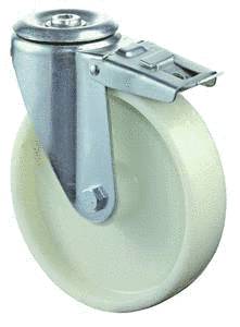 vidlice: ocelový pozinkovaný plech s dvojitým kuličkovým věncem, kolo: bílý polyamid na jehlovém ložisku