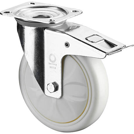 Transportní plastové kolo v otočné vidlici pro vysoké zatížení s brzdou s uchycením na plotnu na čtyři šrouby