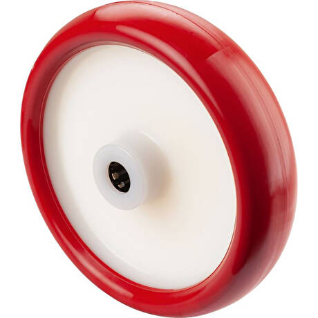 kolo: střed kola polypropylen, běhoun polyuretan červený 98 Sh, jehlové ložisko