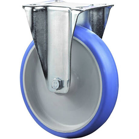 vidlice: ocelový pozinkovaný plech s dvojitým kuličkovým věncem, kolo: bílý polyamid s modrým polyuretanovým běhounem Shore A 85 na jehlovém ložisku